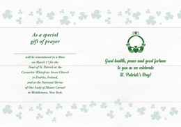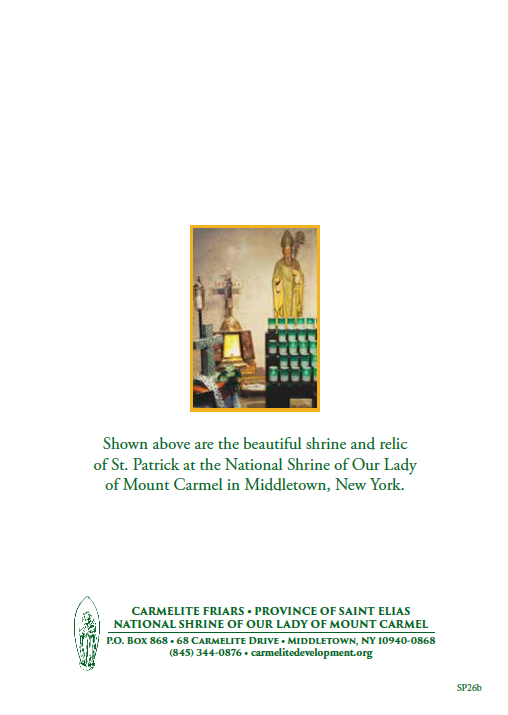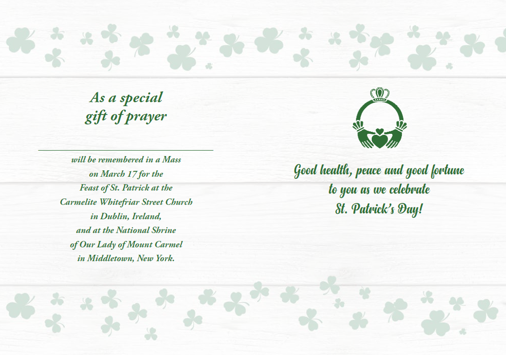 Share the joy of St. Patrick's Day with a Carmelite St. Patrick's Day card! When you send this card, the recipient (s) will be remembered in prayers honoring St. Patrick, Our Lady of Mount Carmel, and Our Lady of Knock. They will also be included in Masses on St. Patrick’s Day at the Whitefriar Street Carmelite Church in Dublin, Ireland, and here at the National Shrine of Our Lady of Mount Carmel in Middletown, New York. The Shrine houses the relics of St. Patrick!