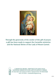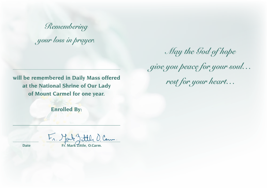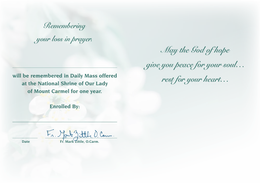 A beautiful Sympathy Card offering one-year enrollment in daily Masses at the National Shrine of Our Lady of Mount Carmel.