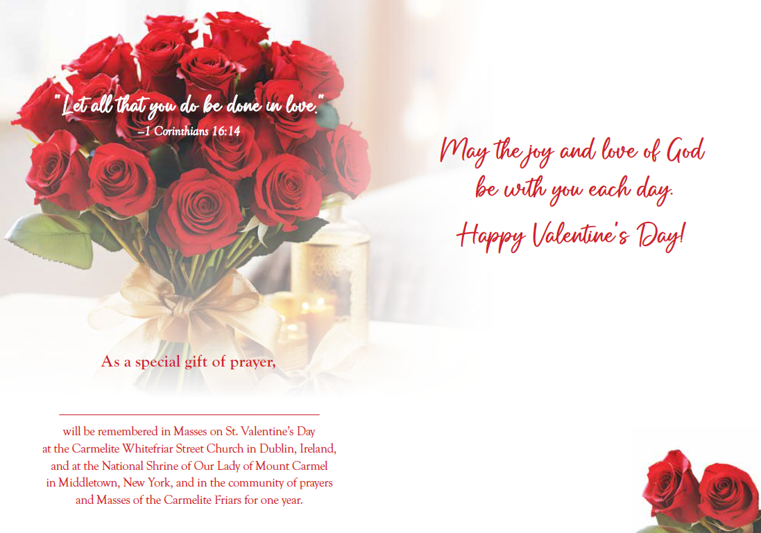Beautiful Valentine's Day One-Year Enrollment Card. The recipient will be remembered in Masses on St. Valentine's Day at the Carmelite Whitefriar Street Church in Dublin, Ireland (which contains the Shrine and relics of St. Valentine!), at the National Shrine of Our Lady of Mount Carmel in Middletown, New York, and in the community of prayers and Masses of the Carmelite Friars for one year.
